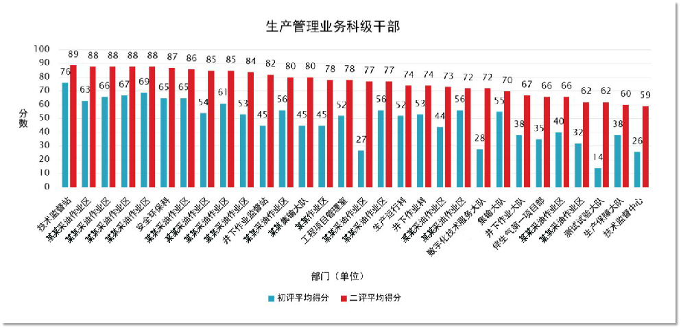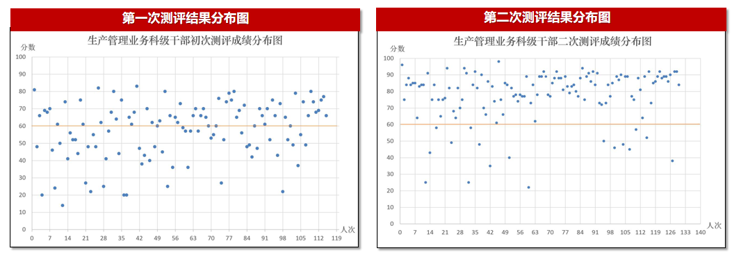 以“生產(chǎn)管理業(yè)務(wù)科技干部”為例,同一部門“兩次”測(cè)評(píng)結(jié)果分布圖,每個(gè)“點(diǎn)”代表該部門的一個(gè)員工(見(jiàn)下圖)。 | |||||||