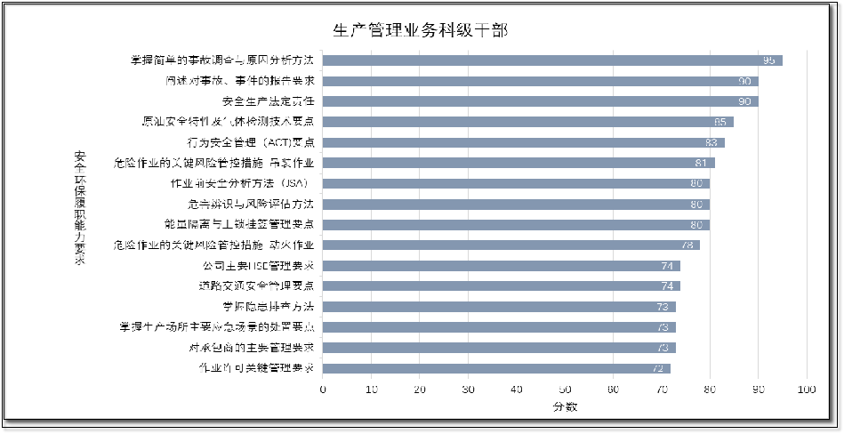 以“生產(chǎn)管理業(yè)務(wù)科技干部”為例,精準(zhǔn)掌握每類人員“安全履職能力”的強(qiáng)弱項(xiàng)(見(jiàn)下圖) | |||||||